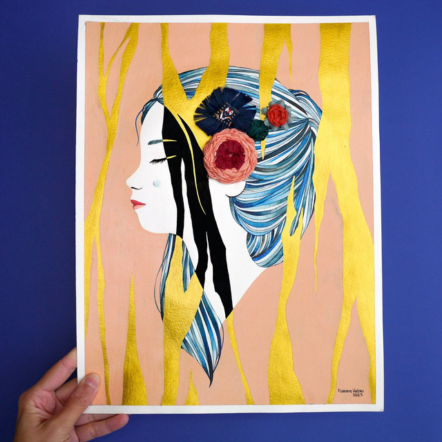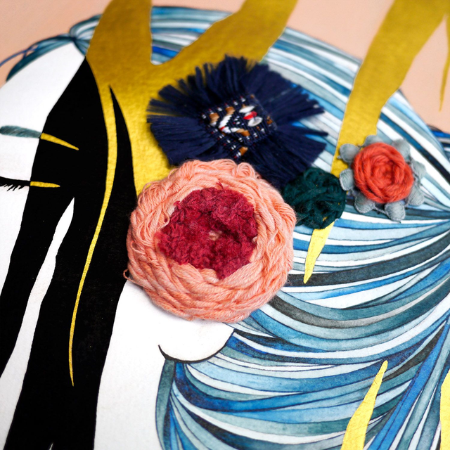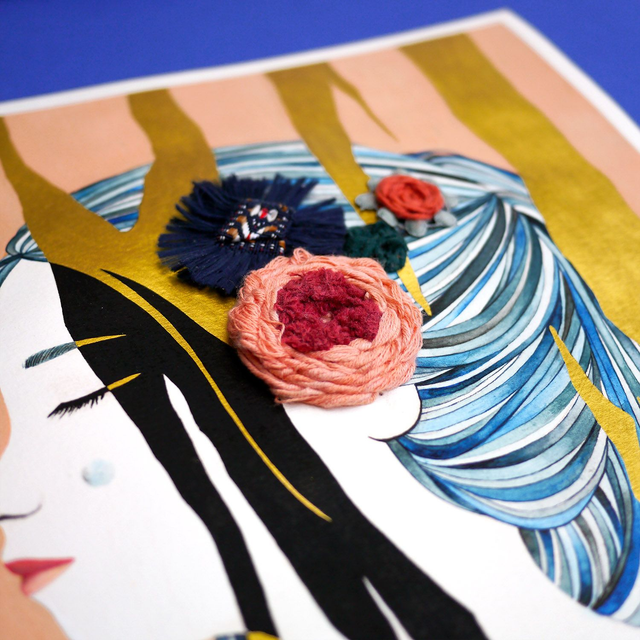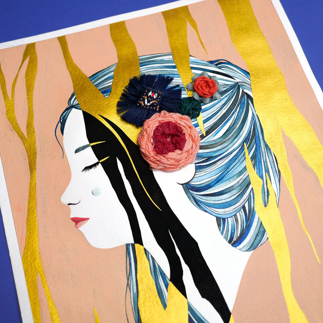 Illustration originale brodée, réalisée à l'aquarelle, gouache et doré sur papier épais sans acide.